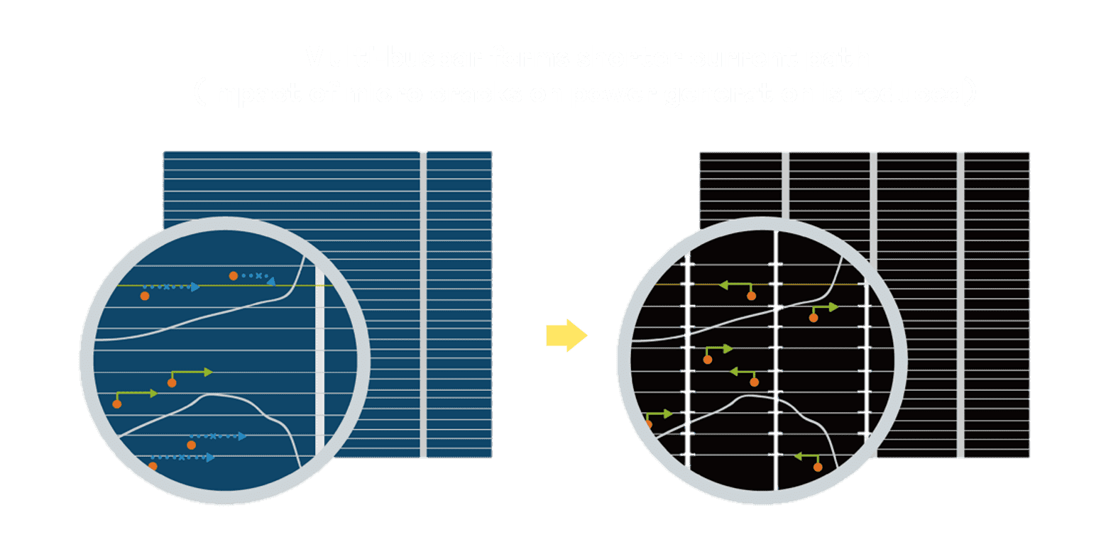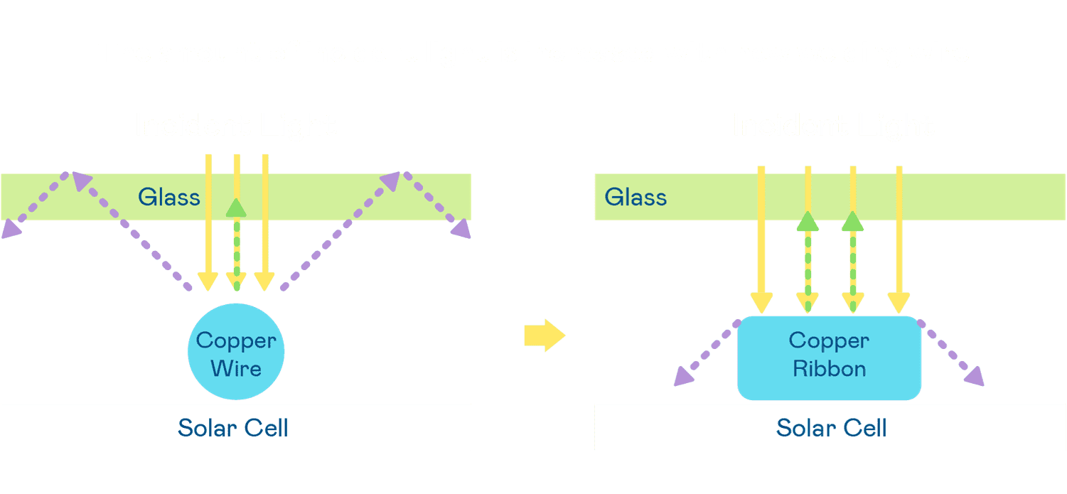 • 电池使用多条铜导线 (Copper wire) 于电池片上形成较短的电流路径,,提高电流收集效率,,采用圆形设计的铜导线较传统扁平式的铜焊带 (Ribbon),,,,可增加入射至电池的光线量。。。