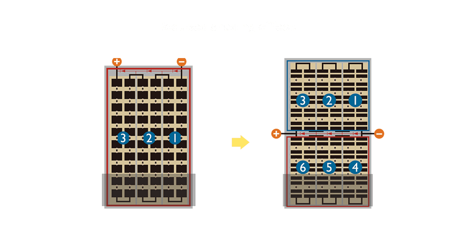 • 结合半切电池,,,,降低遮阴影响、、提升模组抗隐裂能力、、并减少电阻损耗,,,进一步提升模组发电效能。。。。