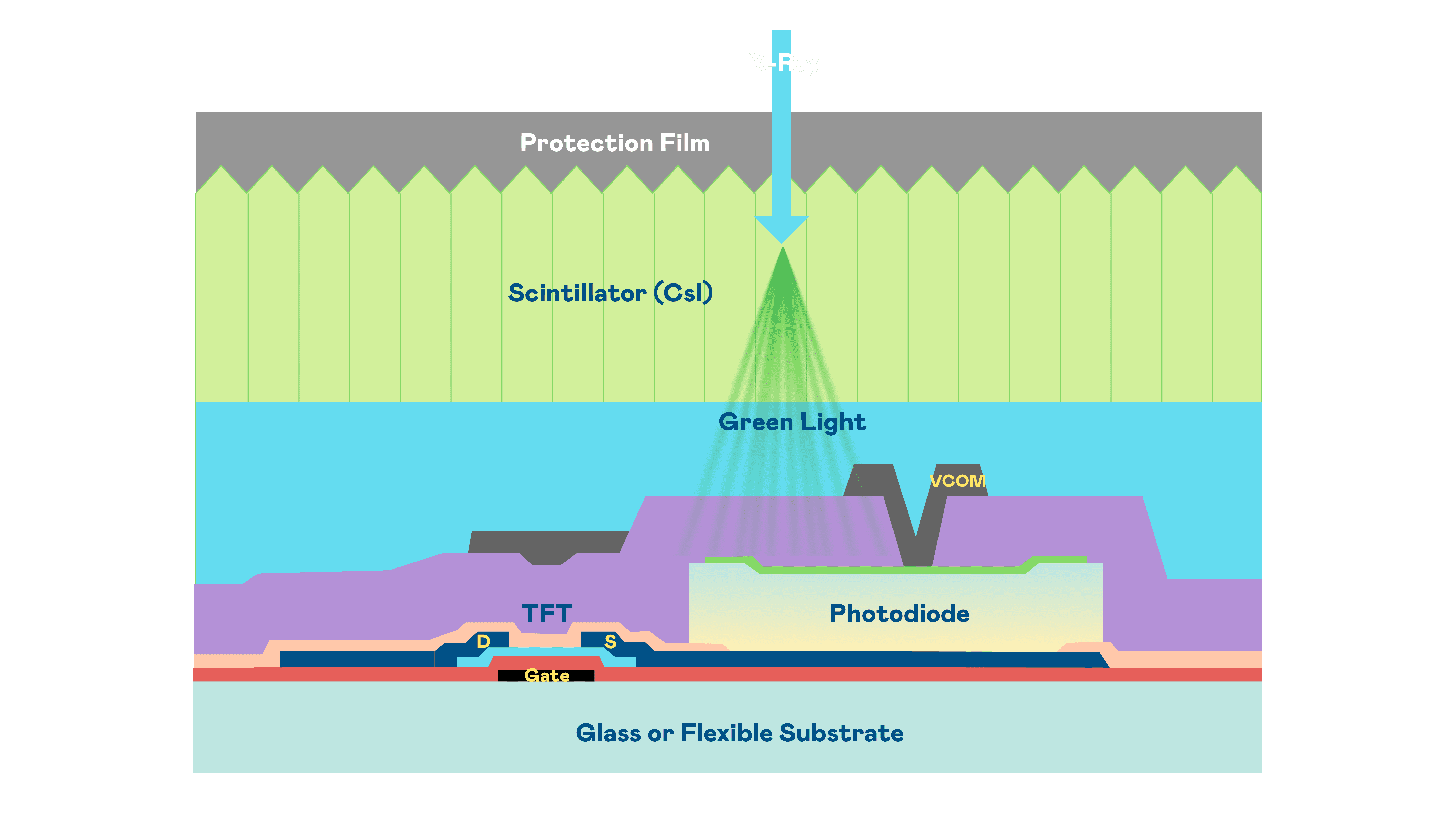 优游UB8的X光影像感测阵列使用薄膜电晶体 (TFT) 作为每个像素的读取开关,,搭配光电二极体(Photodiode)的光电转换元件,,用以感测X光影像讯号。。